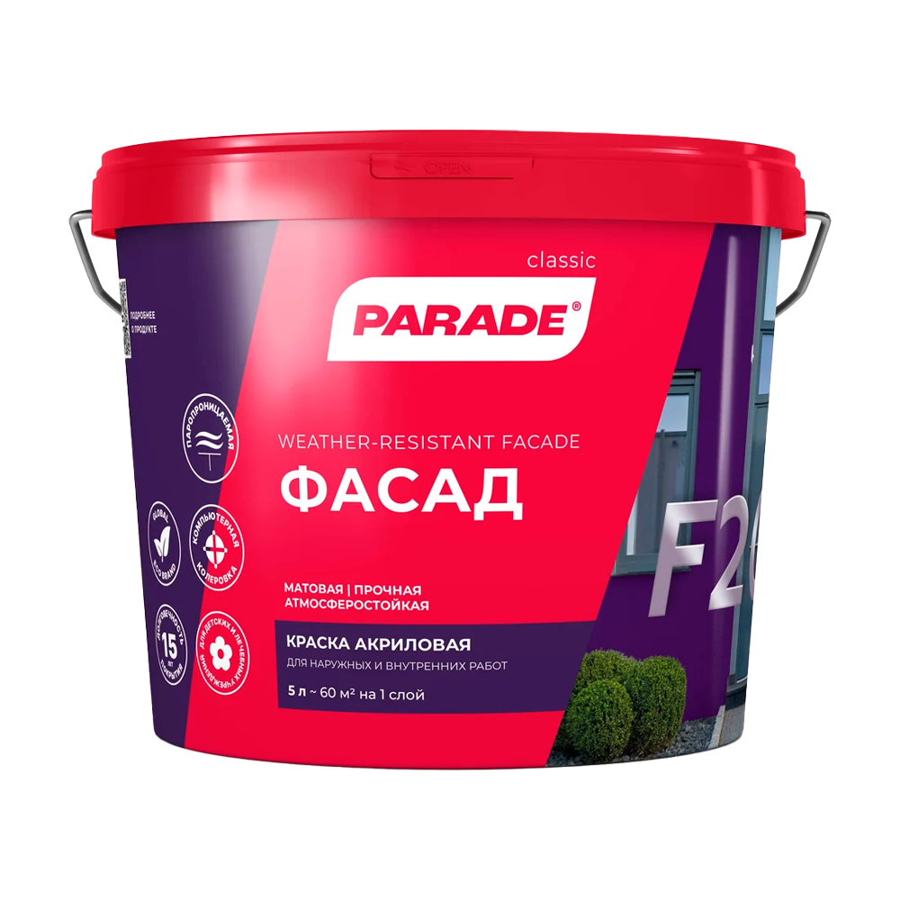 Акриловая водно-дисперсионная фасадная краска. Образует паропроницаемое матовое покрытие, устойчивое к атмосферным воздействиям, УФ лучам, перепаду температур, влаге. Обладает высокими декоративными свойствами, отличной укрывистостью и прочным сцеплением с основанием.